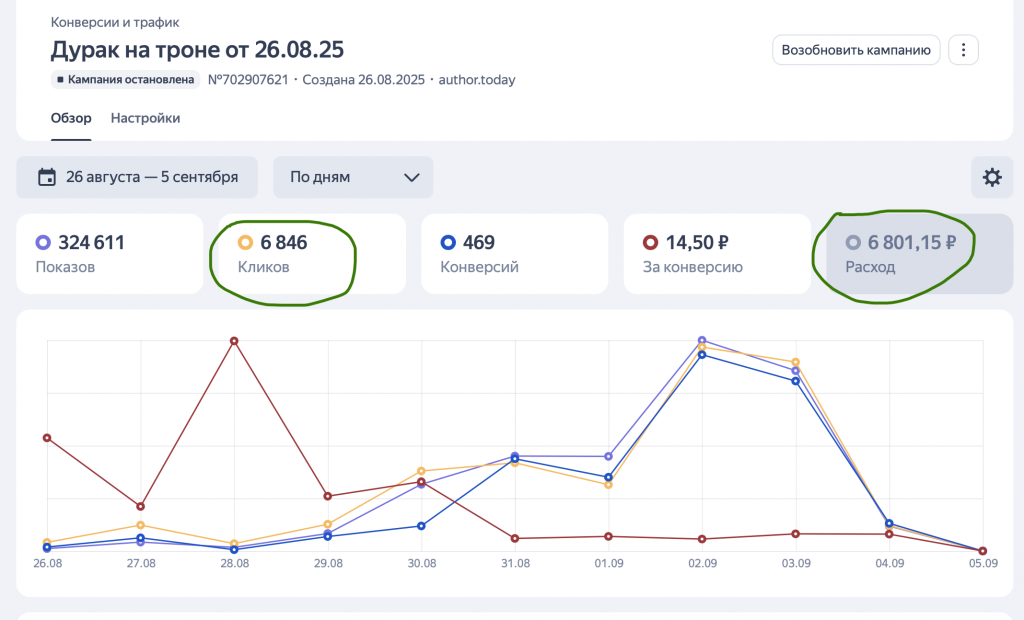 В конце августа я закончил книгу в новом для себя жанре. Решил рискнуть и попытаться настроить контекстную рекламу, чтобы привлечь читателей. Результат меня ошеломил. Всего за 9 дней я получил 6846 переходов всего за 6800 рублей. Другими словами, я получал одного нового читателя меньше, чем за 1 рубль!